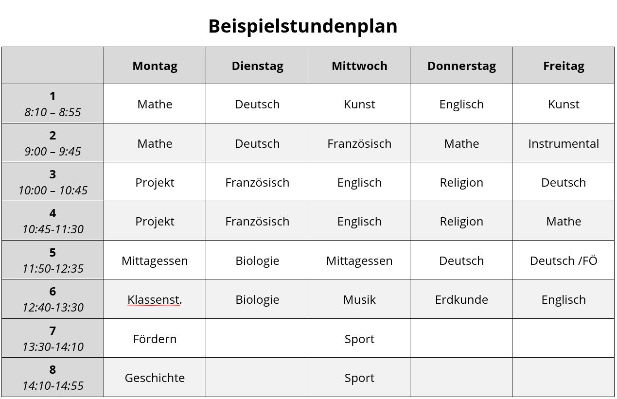 In der Jahrgangsstufe 5 ist an einem Nachmittag Nachmittagsunterricht. Unterrichtsschluss ist dann um 14.55 Uhr. Busse fahren in alle Ortsteile.